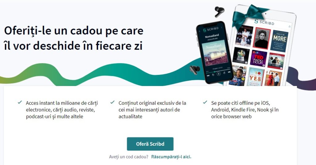Ah, și încă ceva: vrei să faci cadou unei persoane dragi o mulțime de cărți electronice, audio, reviste, podcasturi, etc.? Oferă-i un abonament Scribd. E foarte simplu, trebuie doar să urmezi pașii din acest link.
